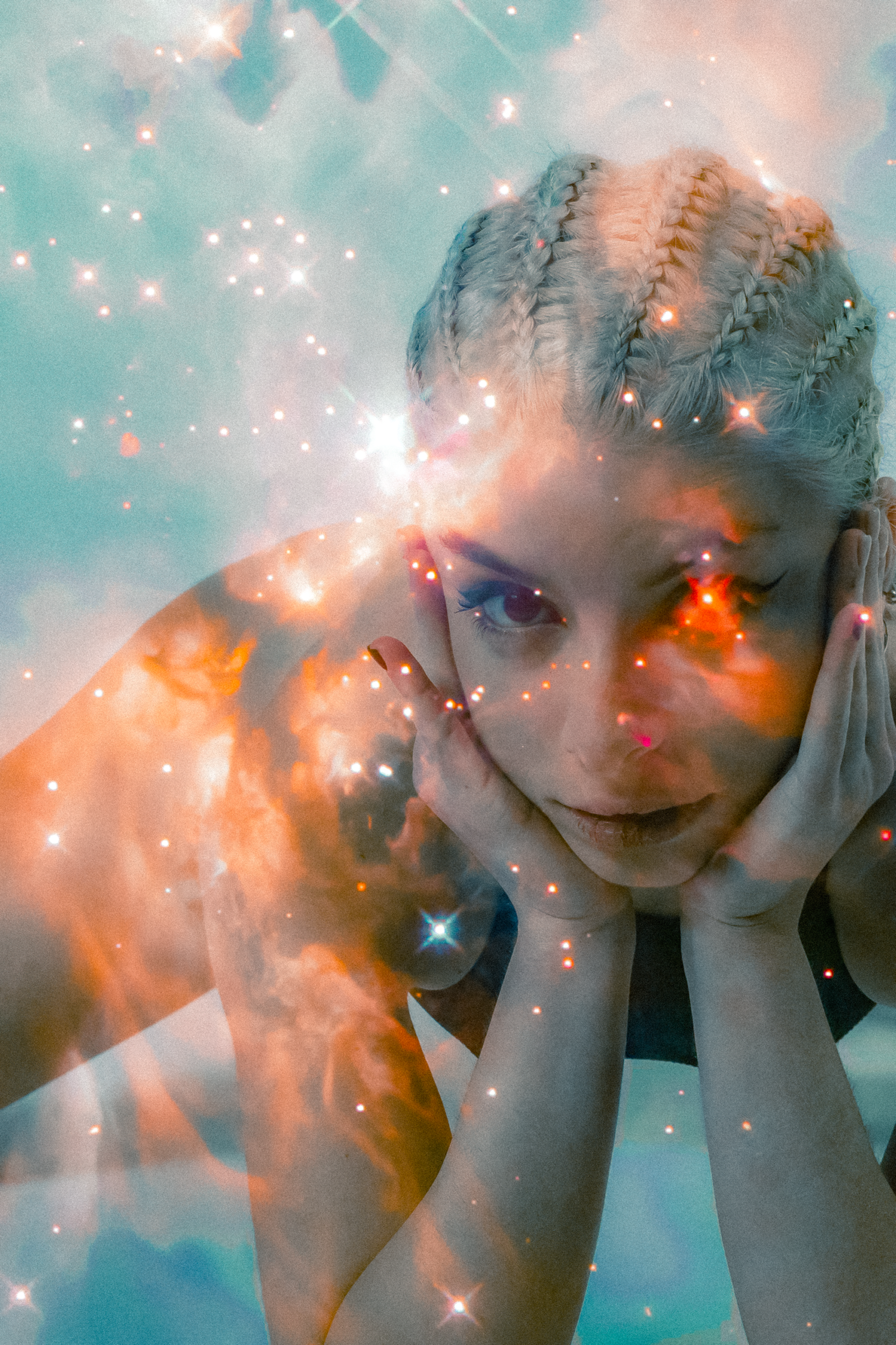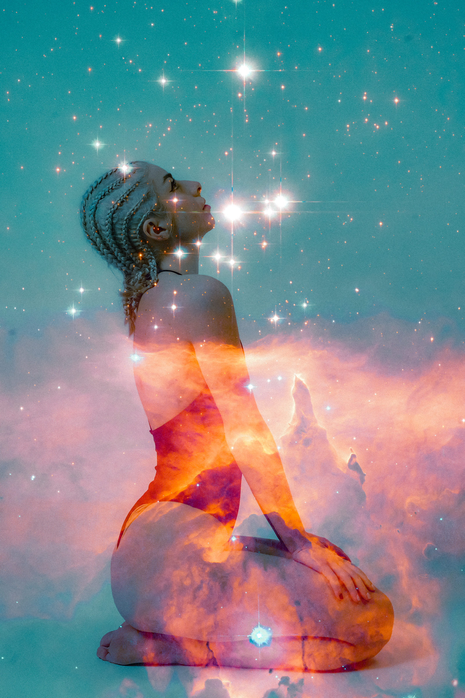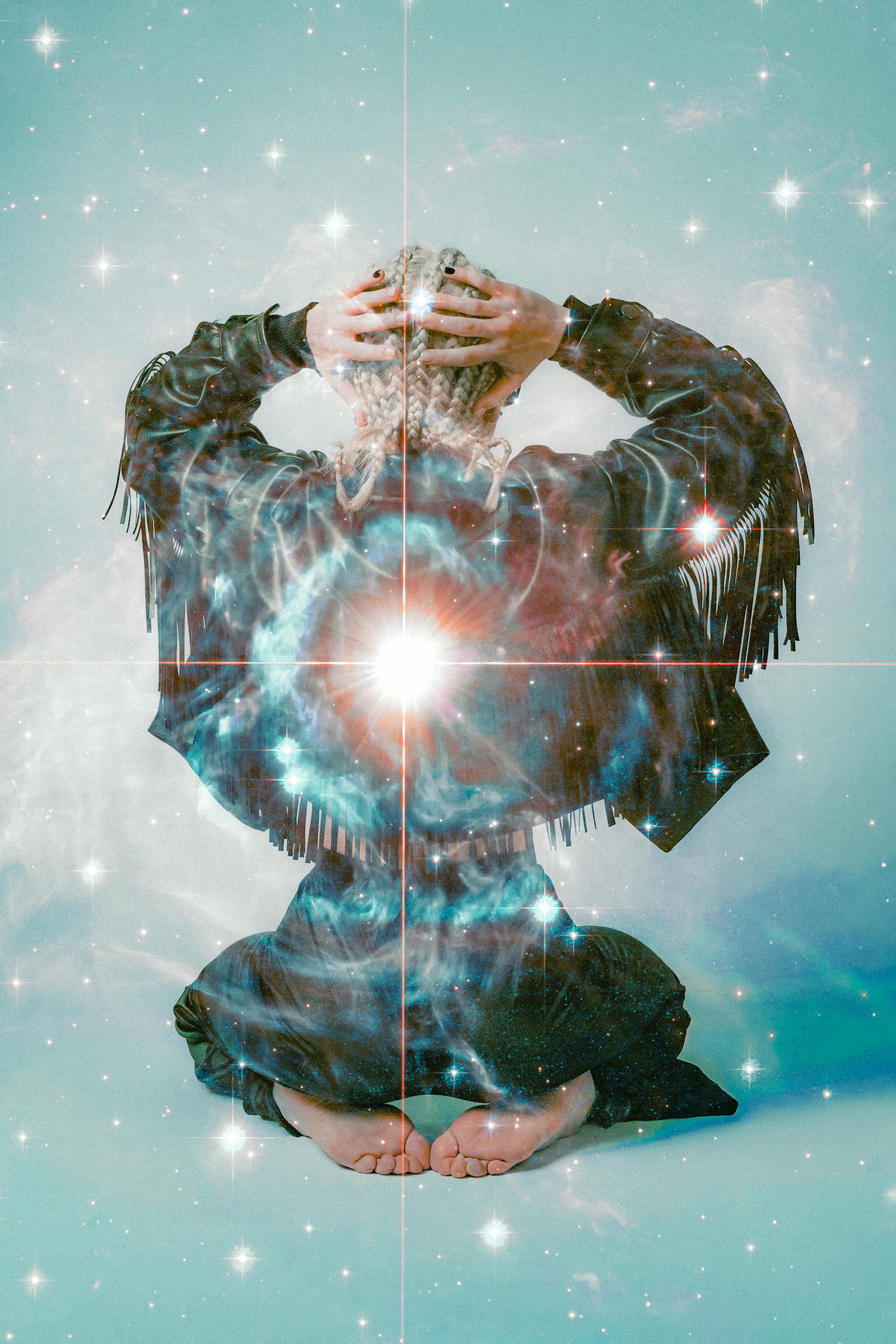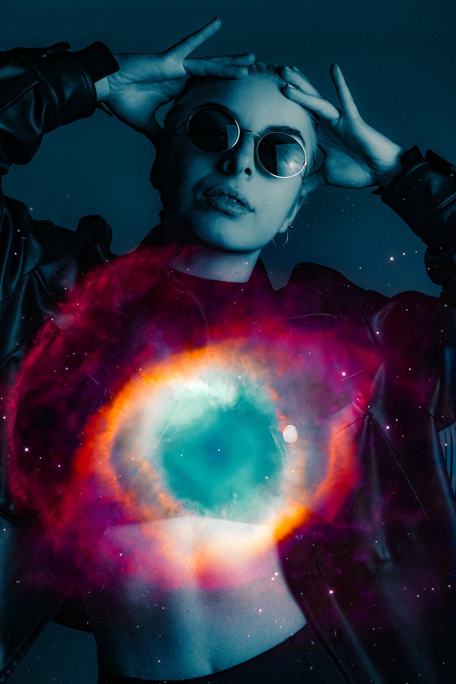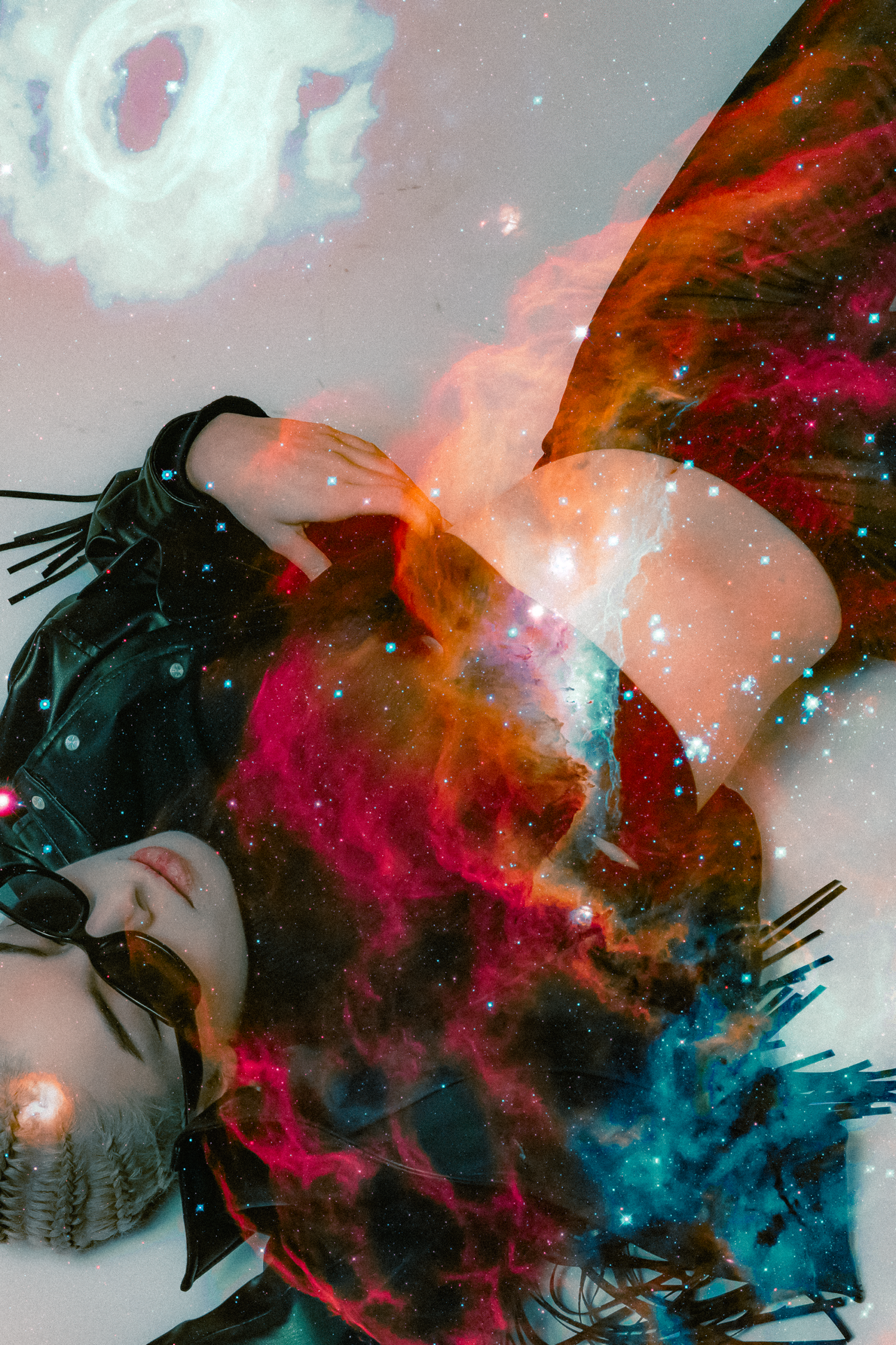 Experimental fashion imagery layered with public-domain astronomical photography from the Hubble Space Telescope, exploring scale, time, and human presence.